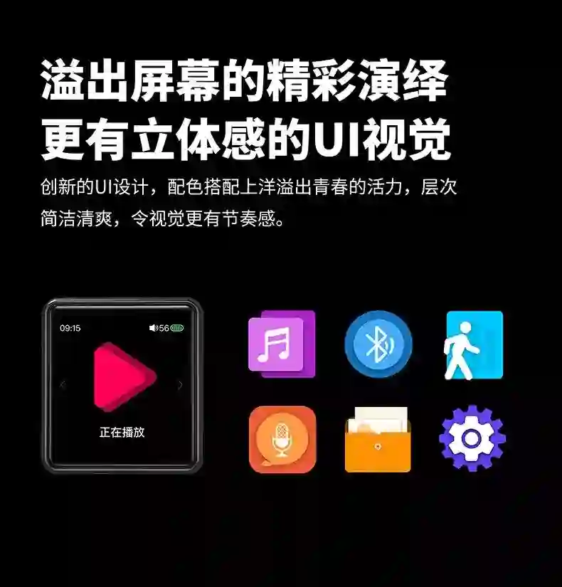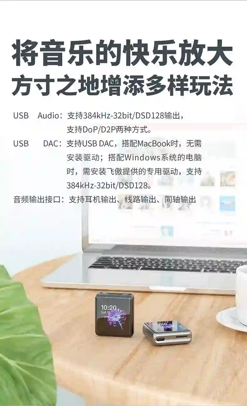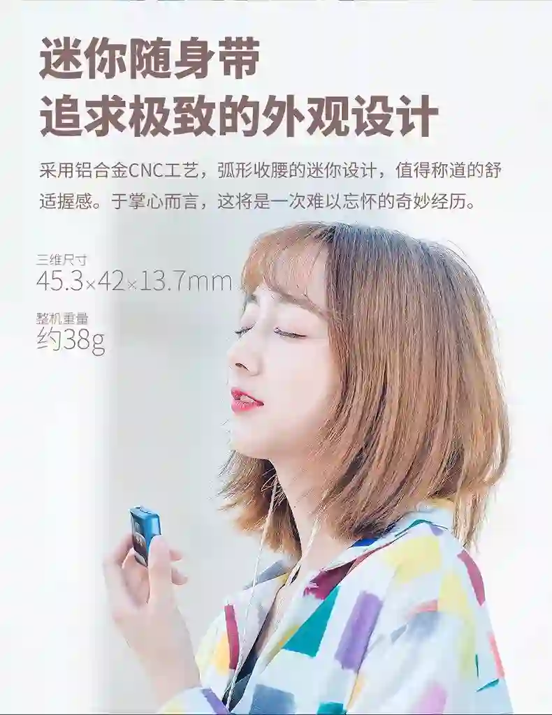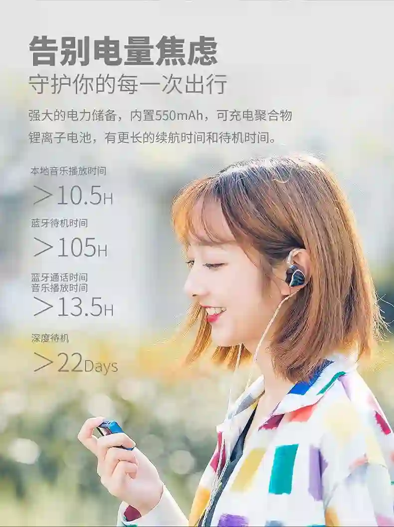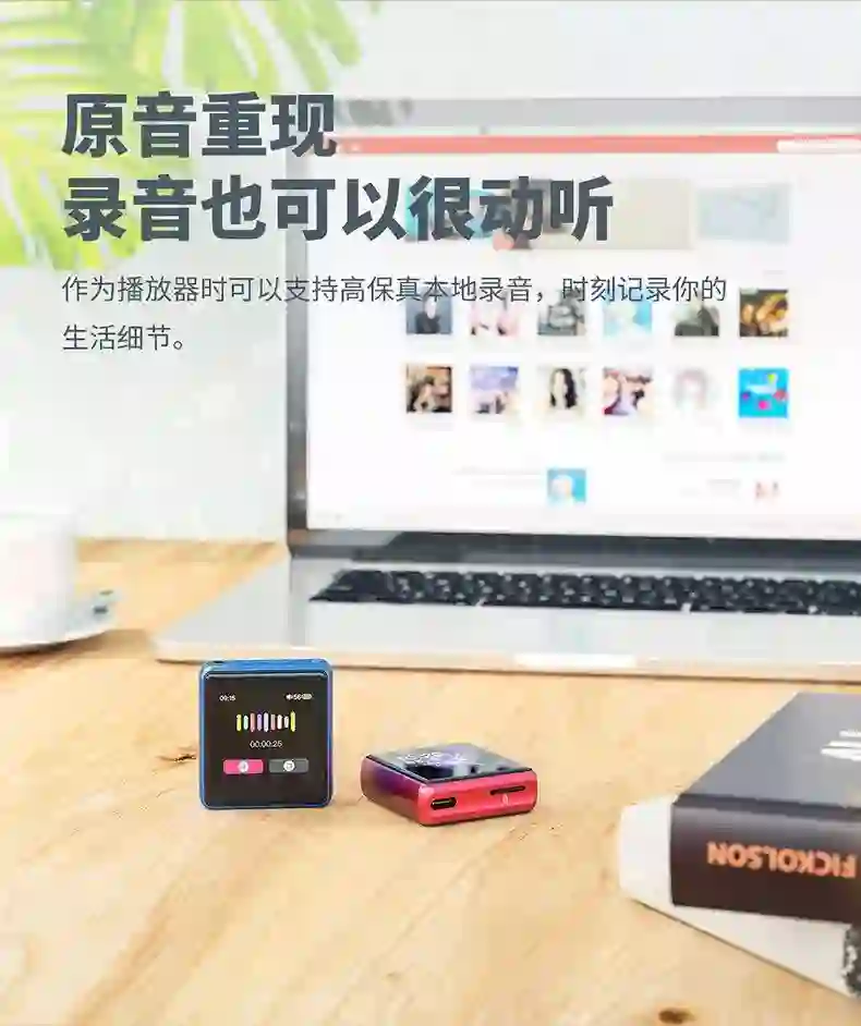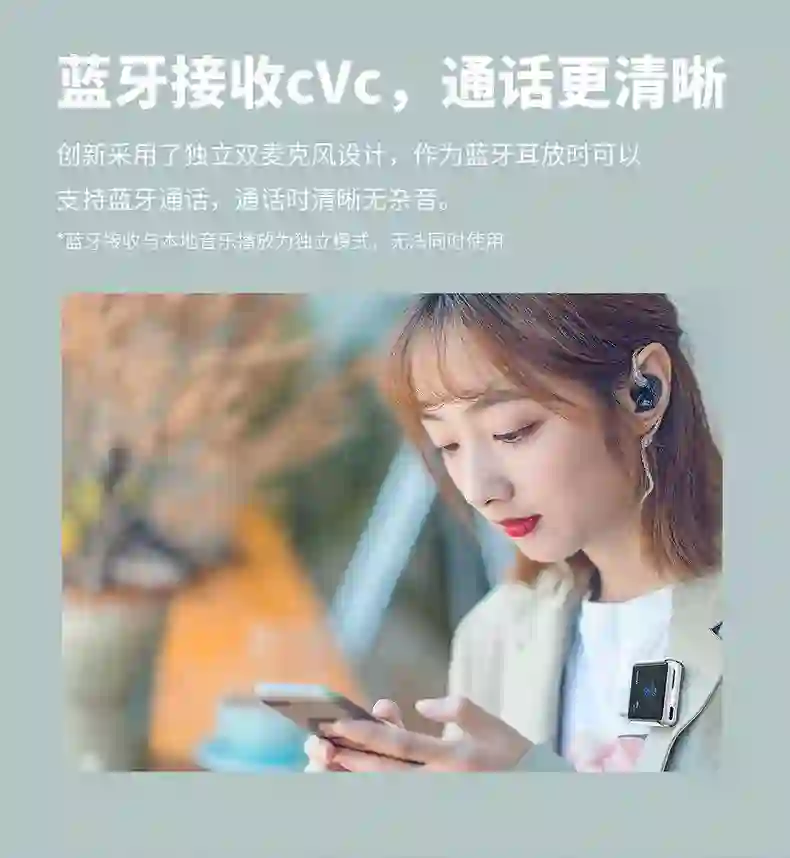 精巧随身,功能丰富。作为音乐播放器而言,M5的硬件配置十分出色,君正X1000E主控+高通旗舰级蓝牙平台CSR867+高性能独立DAC AK4377的强强组合,使M5在音质和功能上都得到了出色的表现,不仅支持aptX/LDAC双向蓝牙,还拥有语音通话、高清录音、运动计步等实用功能。作为可穿戴式设备而言,M5小巧的机身拥有背夹和表带两种佩戴方式,大大丰富了使用场景。触摸+手势+按键操作无论何种场景下体验都十分灵敏,既丰富我们的日常生活,也将音频体验提升到每一个角落。