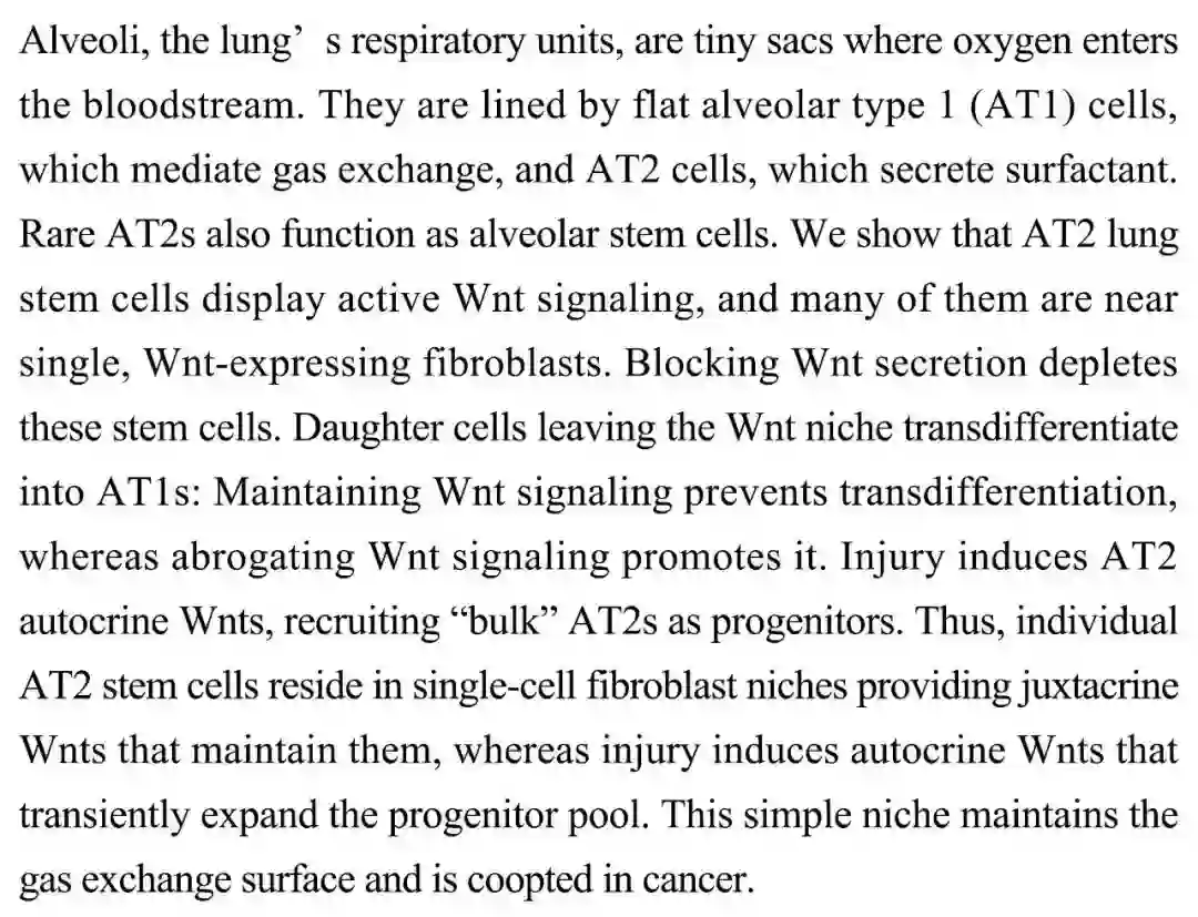 (导读 阿金)肺泡内壁上有介导气体交换的 AT1 细胞和分泌表面活性物质的 AT2 细胞。本研究表明在表达 Wnt 的单个成纤维细胞附近,AT2 干细胞可以显示出活跃的 Wnt 信号传导。而阻断 Wnt 传导会失去这些干细胞。离开 Wnt 微环境的子细胞则会转分化为 AT1 细胞。这个简单的 Wnt 微环境能够维持肺泡表面气体交换。
