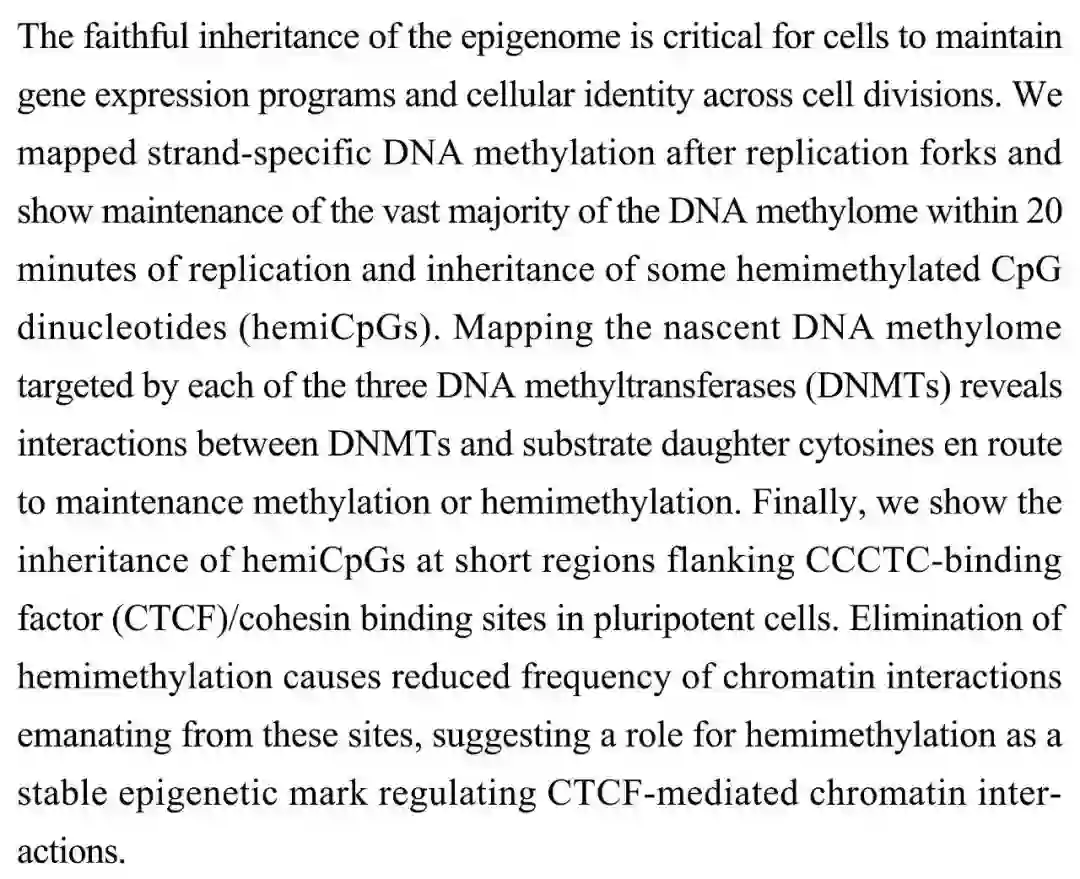 (导读 郭怿暄)细胞分裂中,忠实继承表观遗传组对细胞维持基因表达程序和细胞类型非常重要。本研究对复制叉后 DNA 进行链特异甲基化组测序,发现在复制 20 分钟内三种 DNMTs 与子代胞嘧啶相互作用,使绝大多数 DNA 甲基化保留,一些 hemiCpGs 得以继承。多能细胞中 CTCF/cohesin 位点 hemiCpGs 的继承对其染色质相互作用具有调节作用。