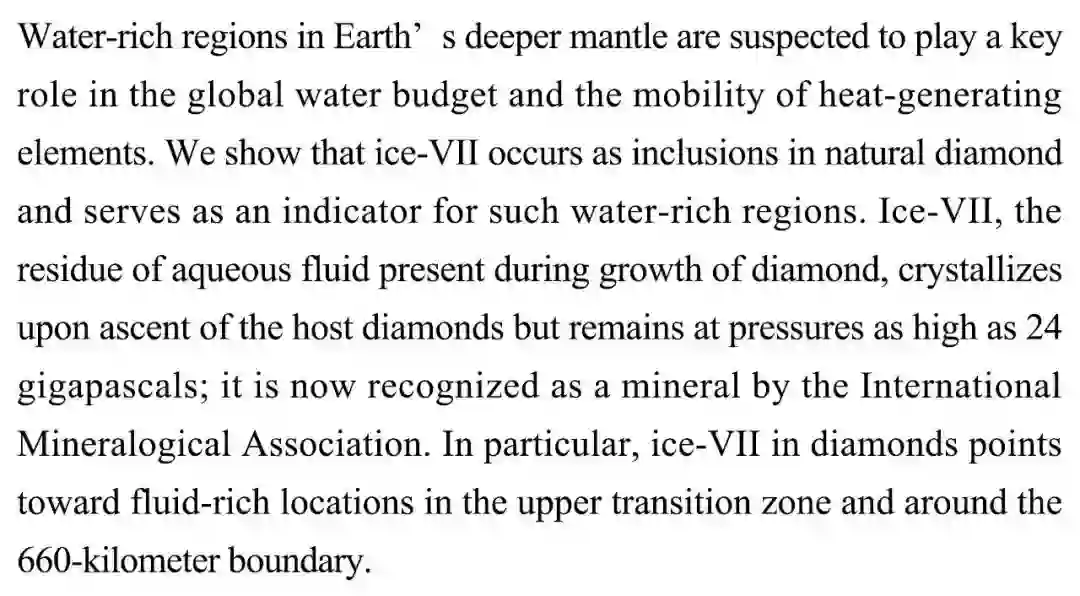 (导读 阿金)地幔深处的富水区域被怀疑影响全球水平衡和发热元素移动。本研究展示天然钻石中存在矿物冰七,冰七是钻石生长向上移动时,残留的极高压的水流体,该矿物指示地球内部过渡带上层和 660 公里边界附近的流体富集区域。
