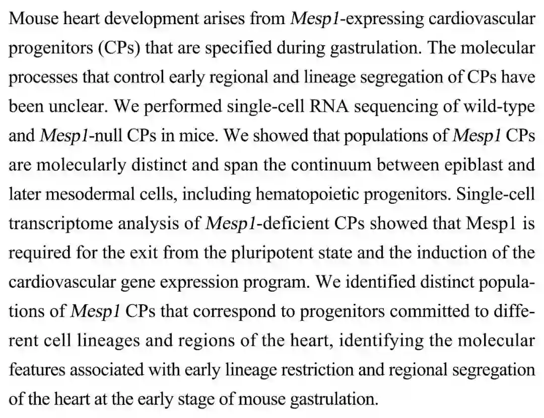(导读 郭怿暄)小鼠的心脏由 Mesp1 表达的心血管祖细胞(CPs)发育而来,但控制早期 CP 区域性和谱系分离的分子过程尚不清楚。本研究通过对野生型和 Mesp1 敲除小鼠的 CP 进行单细胞 RNA 测序,发现 Mesp1 CP 包含多个不同谱系,并鉴定出了其中将发育为心脏各分区细胞的谱系,同时确认 Mesp1 的表达是 CP 离开多能状态而进入分化途径所必需的。