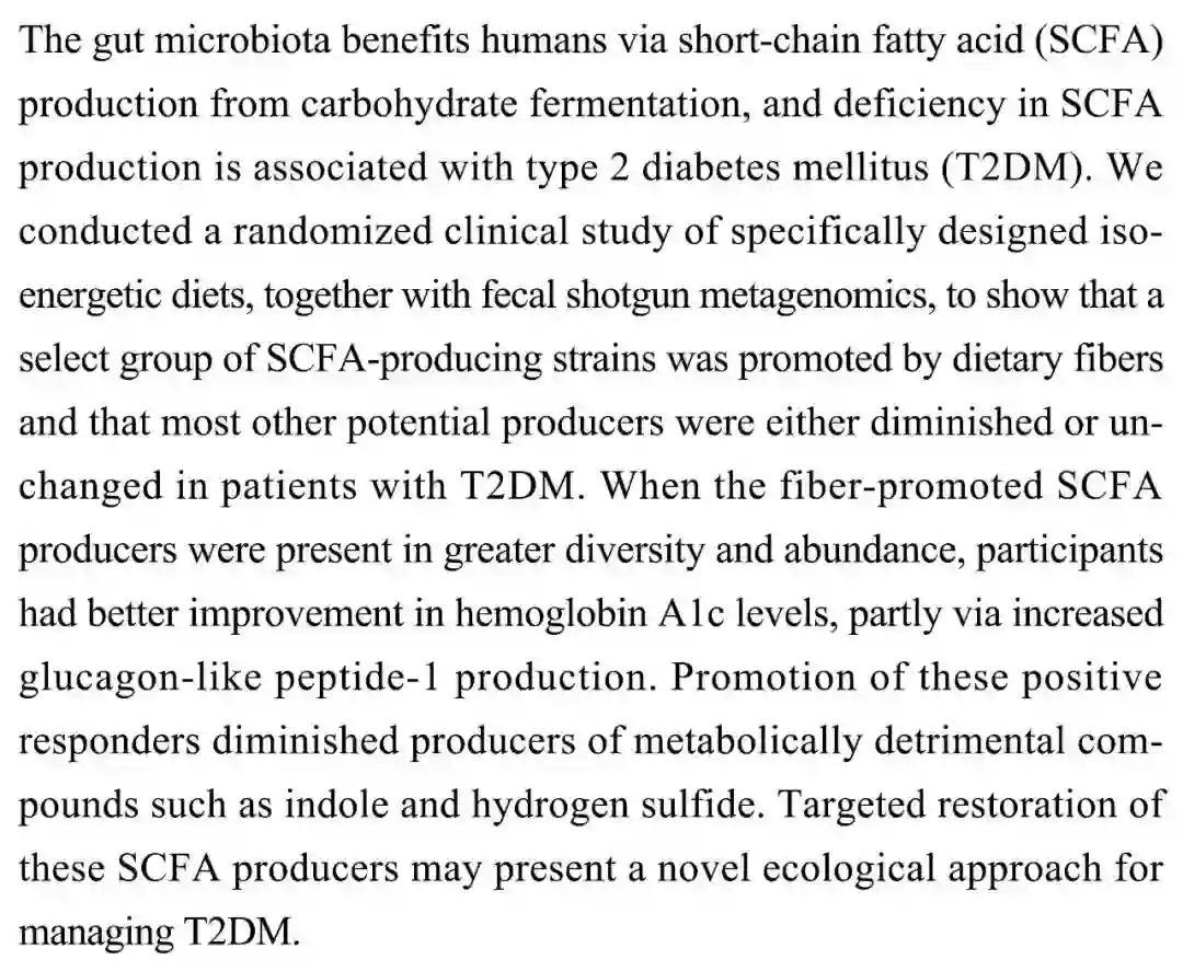 (导读 郭怿暄)肠道微生物组可以通过碳水化合物发酵产生短链脂肪酸(SCFA)使人类获益,SCFA 产生不足与 2 型糖尿病(T2DM)相关。本研究通过等能量饮食随机临床试验和粪便鸟枪法宏基因组学研究发现 T2DM 患者中膳食纤维可选择性促进 SCFA 生成细菌株的存活,当其达到更大的多样性和数量时,患者糖化血红蛋白有效改善,代谢废物吲哚和硫化氢产量降低,提示一种处理 T2DM 的全新生态学方法。