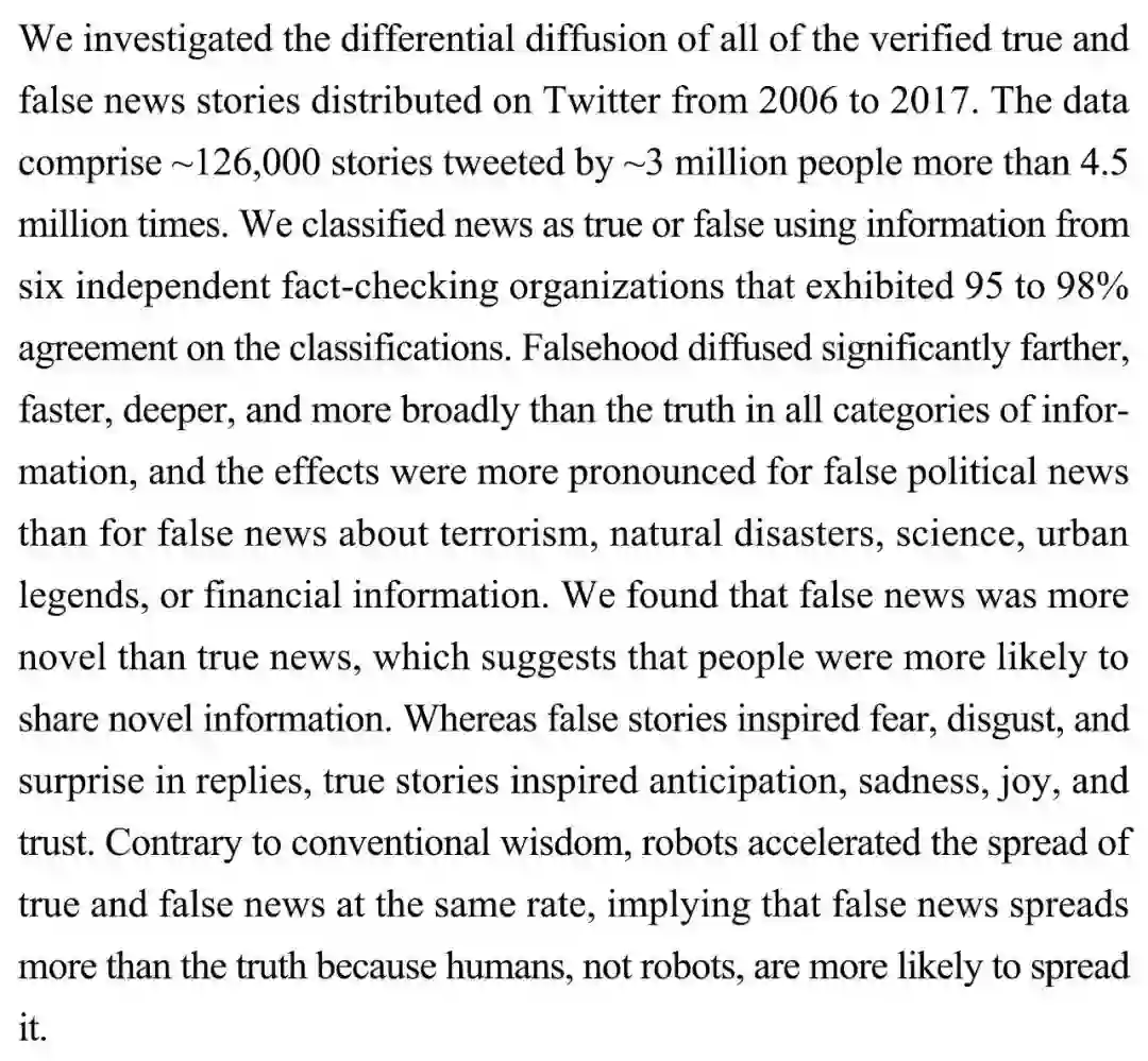 (导读 阿金)本研究调查 2006 年至 2017 年推特上所有新闻的扩散差异,通过六个独立事实核查组织完成一致率为 95%-98%的真假信息分类。发现假新闻传播得更快更广,尤其是虚假的政治新闻比恐怖主义、自然灾害等更深入人心。假新闻更具故事性,更容易触发人类恐惧、厌恶等情感,人们也更愿意传播假消息。