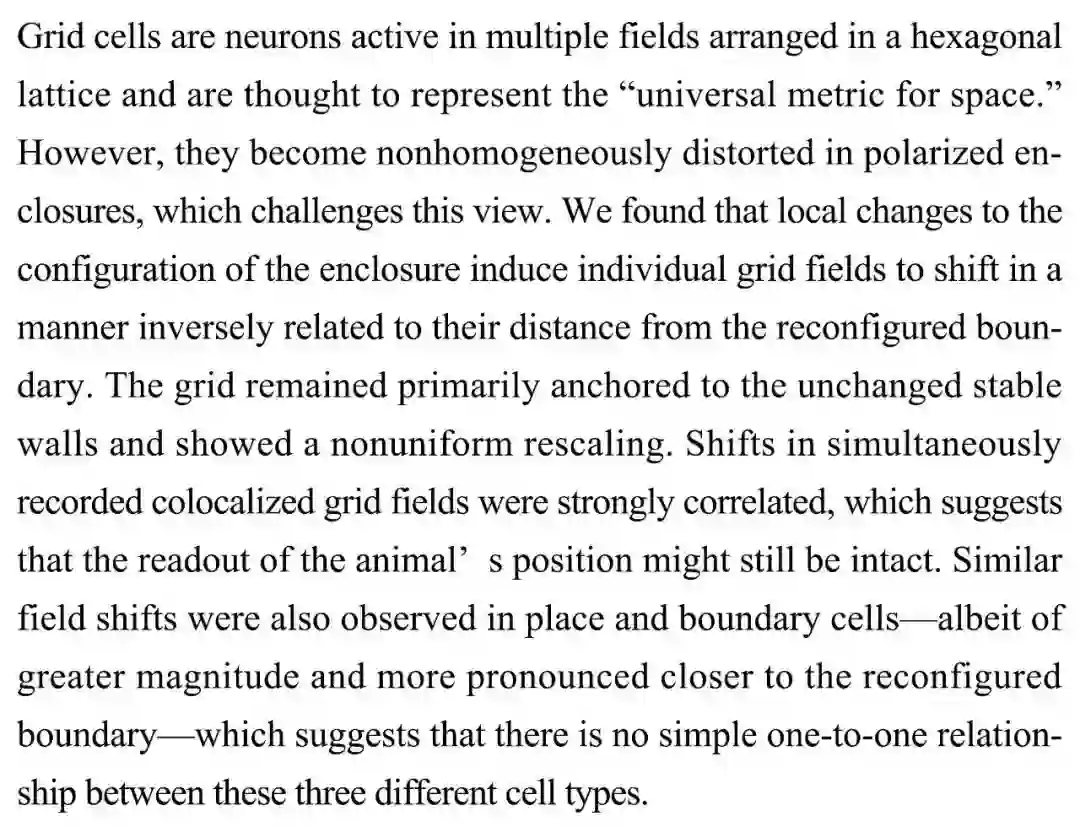 (导读 寒雨)大脑中网格细胞的放电野曾被认为与观察区内的空间位置一一对应,但观察区大小会改变网格细胞网络模式的发现对此提出挑战。本研究发现此种改变与各网格细胞与变化边界的距离成反比,也就是远离变化位置的网格细胞放电野保持稳定,仍可提供稳定的空间感知。类似的转变在位置细胞和边界细胞中也存在,表明这三种细胞间不存在简单的一对一关系。