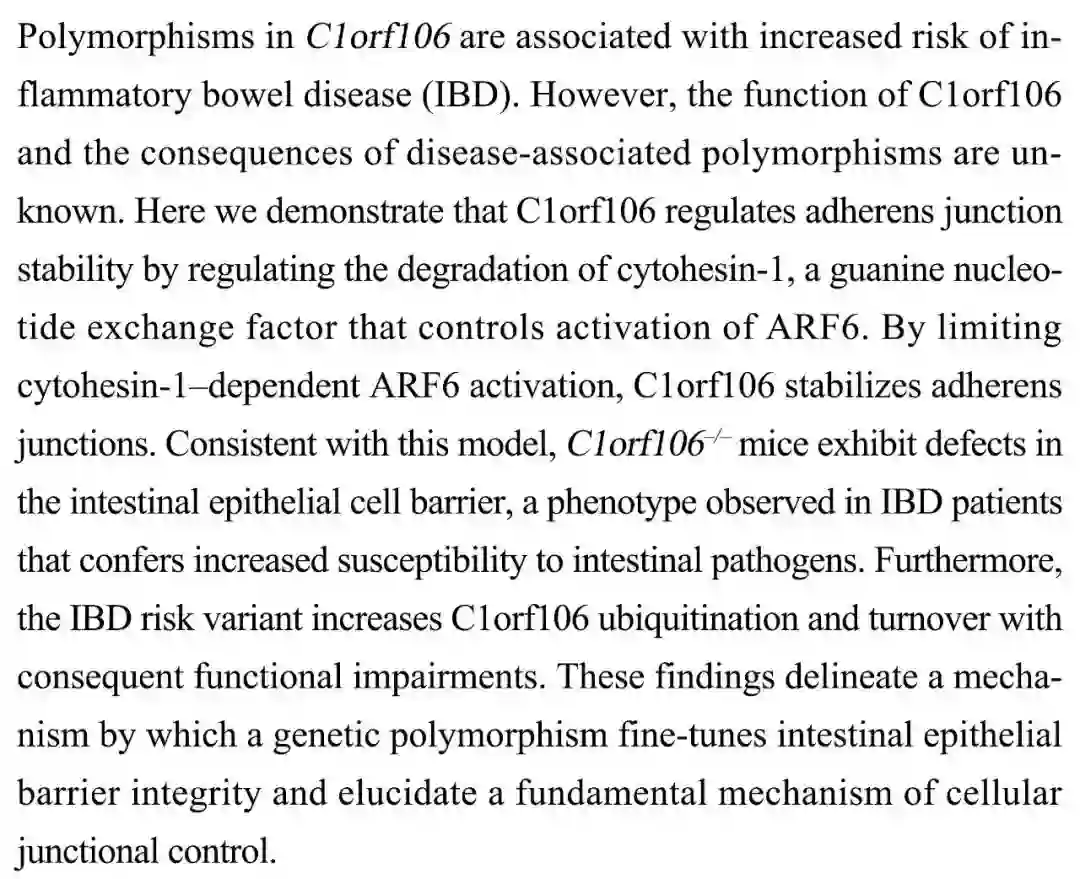 调节肠道上皮粘着连接稳定性的结肠炎风险基因——C1orf106