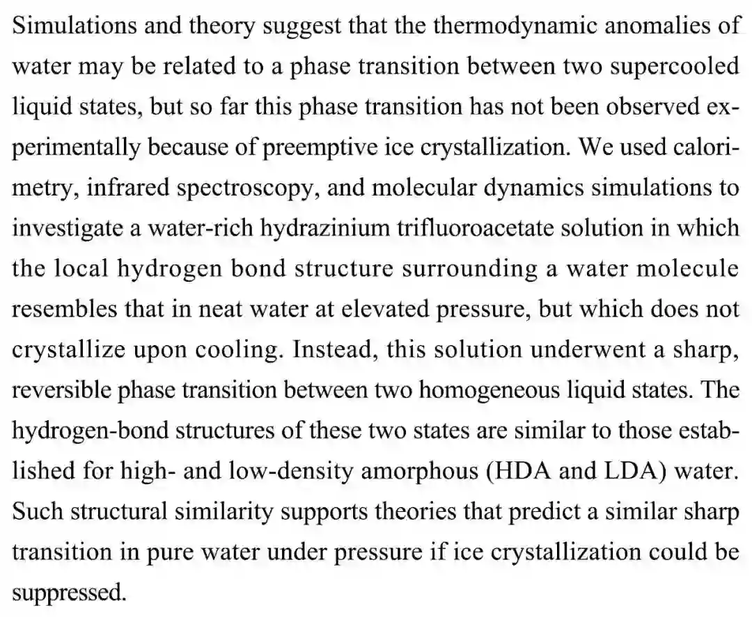 (导读 阿金)模拟和理论认为水的热力学异常可能与两种过冷液态间的相变有关,目前尚无实验证明。本研究使用量热法、红外线光谱和分子动力学模拟分析富含水的肼三氟乙酸盐溶液在两种同质液态间发生急剧可逆相变,其中水分子氢键结构类似于 HDA 和 LDA 水中的氢键结构。研究结果可用于预测纯水在高压下类似的骤变。