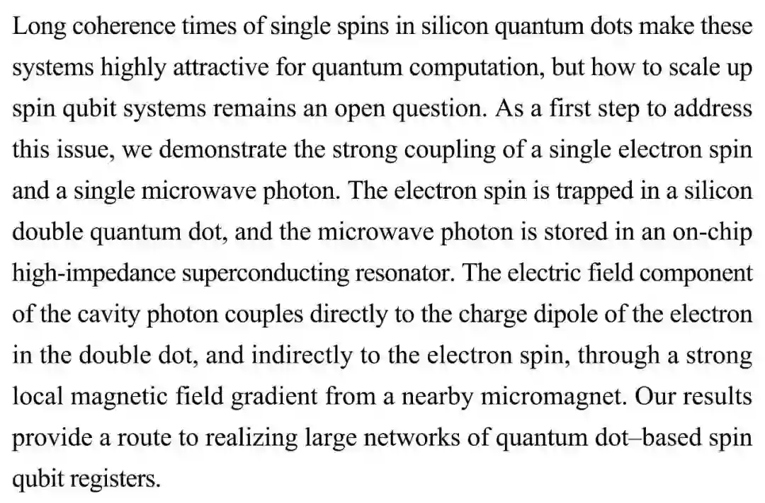 (导读 甜甜)如何在硅量子点中增大自旋量子位的规模一直都是一个难题。本研究展示了单电子自旋和单微波光子的强耦合。电子自旋被困在硅双量子点内,微波光子储存于高阻抗超导共振腔内,通过腔光子的电场分量间接耦合电子自旋。研究结果为实现基于自旋量子位寄存器的大型网络化提供了一个途径。