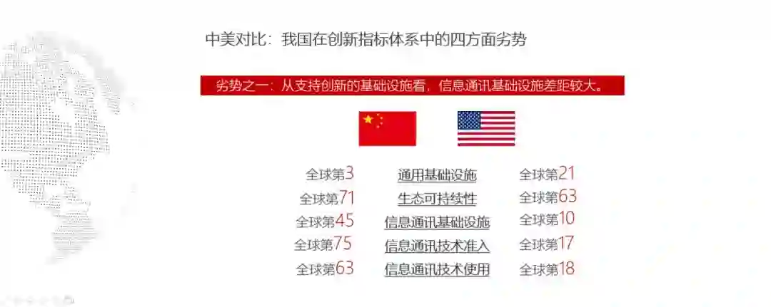 信息通信基础设施中国全球第45,美国第10。而准入方面,中国第75,美国第17。通讯技术使用上,中国排名65,美国全球18。