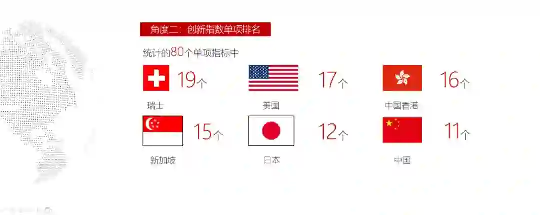第二个角度,如果看创新指数单项排名。在统计的80个指标中,大家可以注意到一个很有意思的现象,排名靠前的有中国和中国香港。