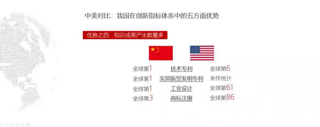 第四,知识成果产出数量多。技术专利中国现在成了第1,美国第6;工业设计中国是第1,美国第61;商标注册中国第3,而美国第86。2017年,中国专利申请有38.2万件,授权发明专利42万件,大于美日欧总和。