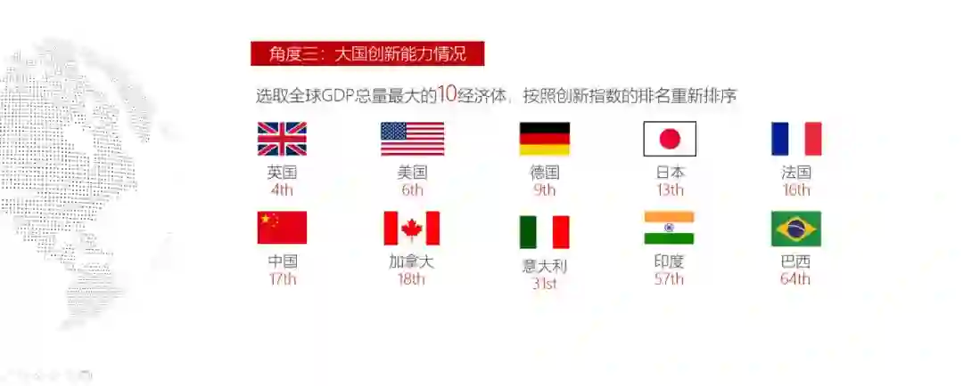 第三个指标,大国创新能力状况。进入全球GDP前10的经济体,按照创新重新排序,中国排到第6。