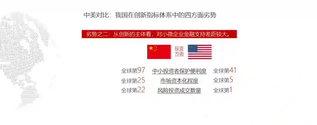 优势讲完了。我非常强调的是,大家要关注中美两国在创新指标体系中,中国的弱势在哪里。这就是我们下一步要改进的地方,我们说:缺憾即空间。