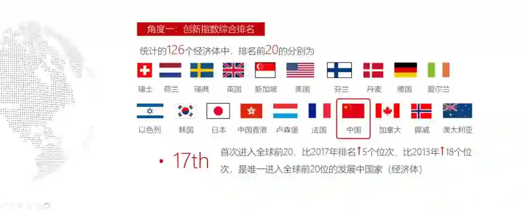 在126个经济体中,中国排名第17位。创新指数第1名是瑞士,美国是第5名,中国上升地非常快,这是第一次进入全球20强。