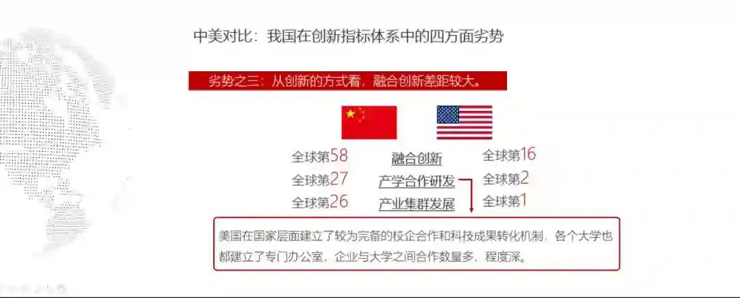美国非常强调融合创新,而中国在这方面差距很大。产业集群发展中国排名第26,美国排名第1。