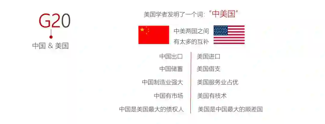 “G2”概念是美国学者提出来的,就是中国和美国。中美两国合则两利、斗则两伤,因为有太多的互补:中国出口,美国进口;中国储蓄,美国借支;中国制造业强大,美国服务业占先;中国有市场,美国有技术;中国是美国最大的债权人,而美国是中国最大的顺差国。
