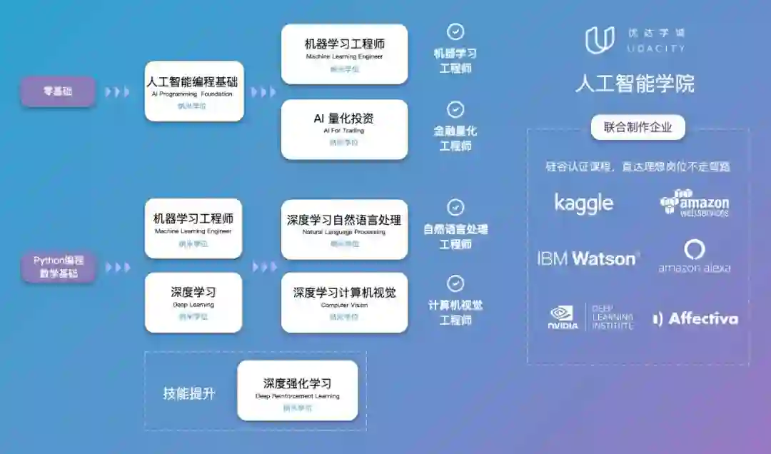 2016 年登陆中国后,与更多中国企业达成合作,腾讯、京东、唯品会等互联网名企,都将 Udacity 纳米学位项目作为员工的内部培训内容,纳米学位在中国的影响也在逐渐扩大;在全球,包括AT&T、通用电气、普华永道、埃森哲、戴姆勒奔驰等知名企业在内,都将 Udacity 作为 AI 培训首选。