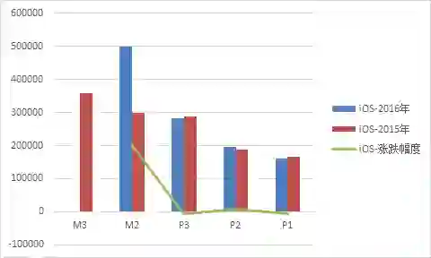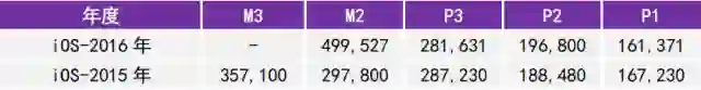 2016年与2015年iOS开发岗实际总现金薪酬50分位对比: