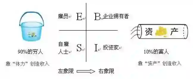 处于E、S象限的人无法达到财富自由,占总人数的90%;而只有10%靠“资产”创造收入的人才算是财富自由。