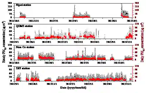 图1. 青藏高原背景大气细颗粒物PM2.5质量浓度的小时和日平均值