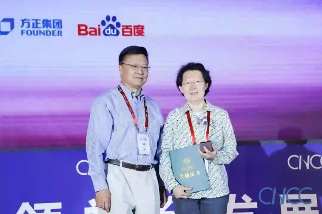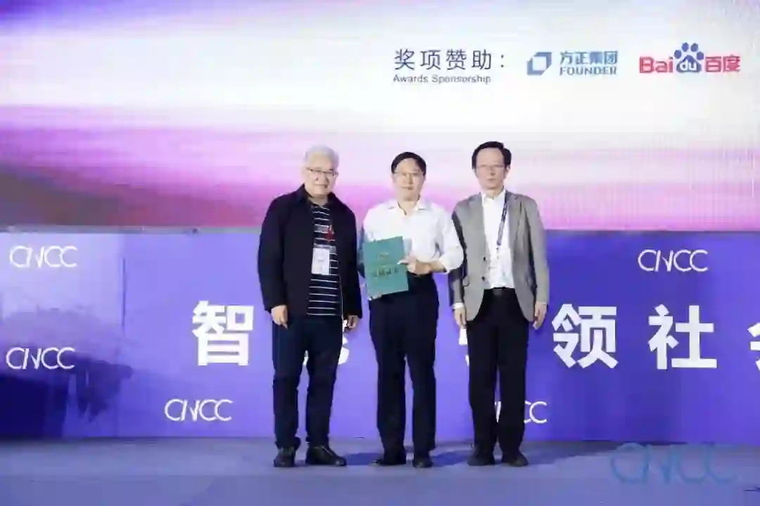 CCF前理事长郑纬民(右一)、CCF副理事长孙凝晖(左一)为技术发明奖一等奖颁奖