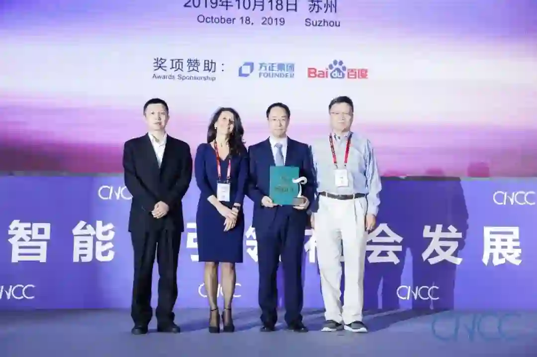 CCF理事长高文(右一)、百度集团首席技术官(CTO)王海峰博士(左一)、IEEE CS主席Cecilia Metra(左二)为尹一通教授颁奖