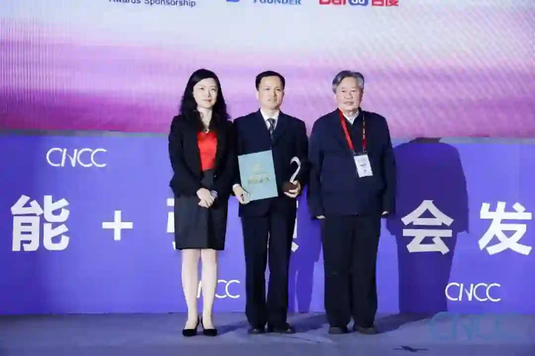 CCF理事长高文(左一)CCF副理事长王巨宏(右一)为自然科学奖二等奖颁奖