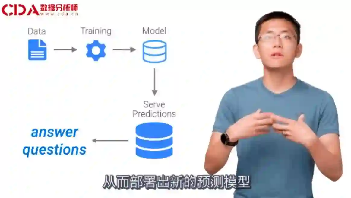 下面让我们简单看下这两部分。训练就是使用数据来创建和调整预测模型,该预测模型之后可以对新的数据进行预测,并解答那些问题。随着收集的数据越来越多,模型会不断改进,从而部署出新的预测模型。