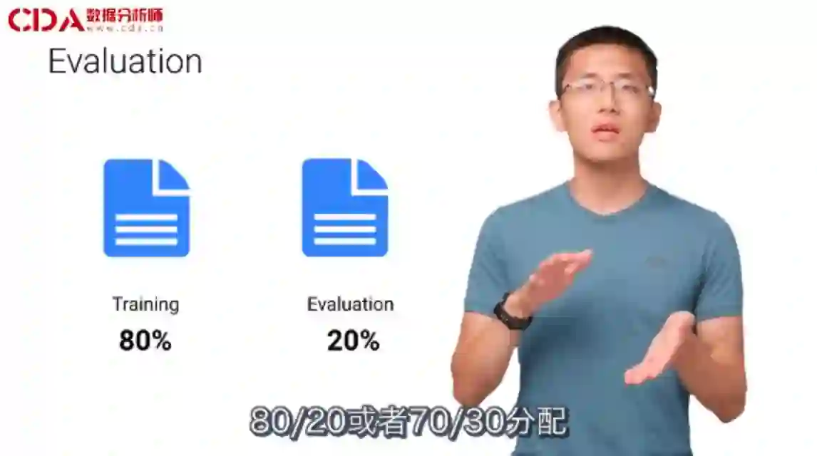根据经验法则,我一般将训练和评估数据按照80/20或者70/30分配。大多情况下取决于原始源数据集的大小。如果数据很多可能就不需要太多的测试数据集。