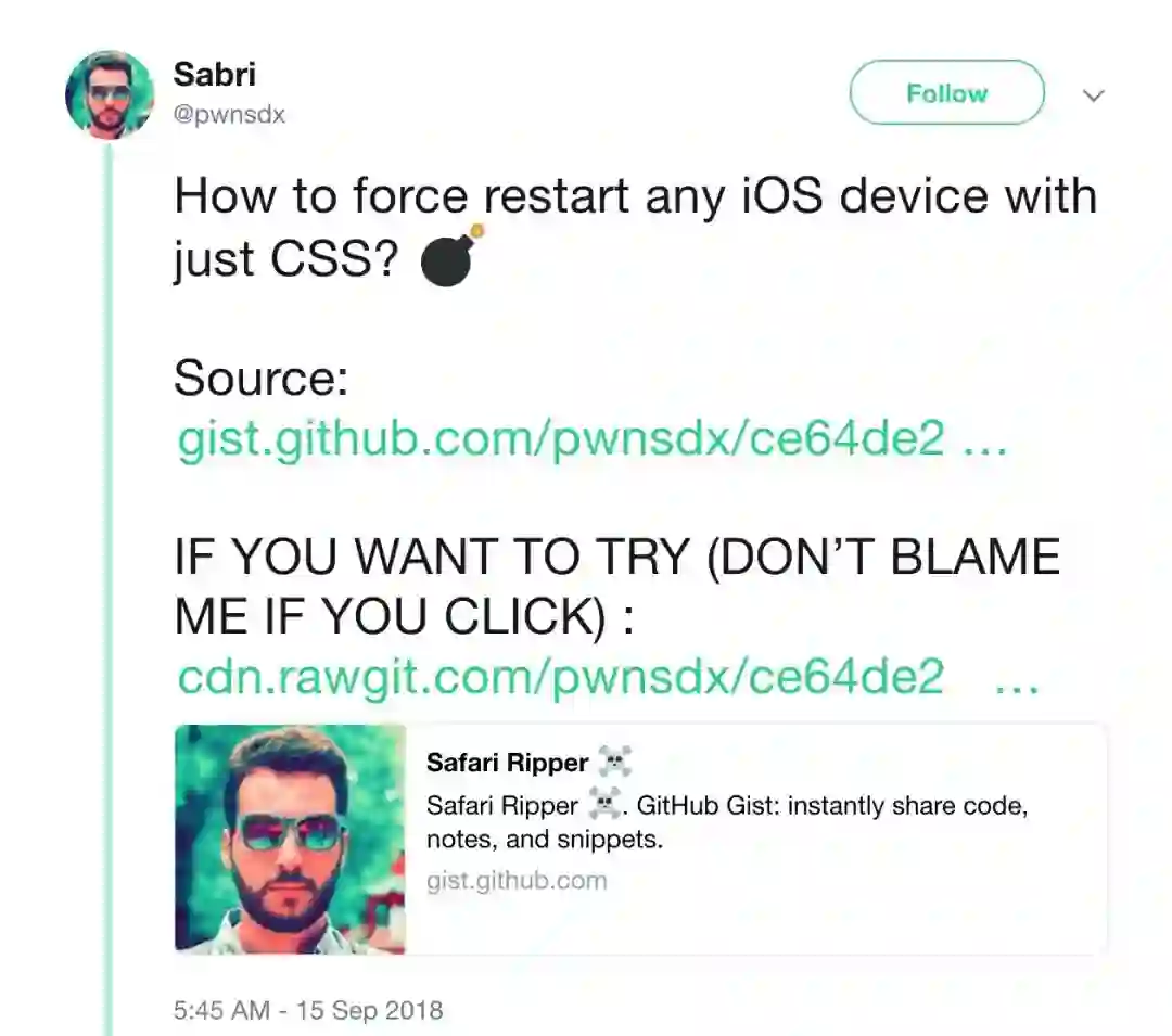 Sabri Haddouche 在 GitHub 上发布了一个示例网页,只有 15 行代码,如果在 iPhone 或 iPad 上访问这个页面,就会崩溃并重启。在 macOS 上使用 Safari 打开该页面也会出现浏览器挂起,无法动弹。