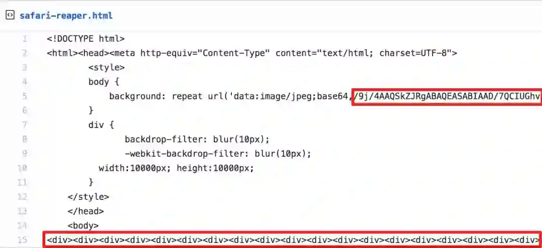 这段代码利用了 iOS Web 渲染引擎 WebKit 中的一个漏洞。Haddouche 解释说,在 CSS 过滤器属性中嵌套大量元素(如<div>),就会耗尽设备的资源,并导致内核崩溃,然后关闭并重新启动操作系统。