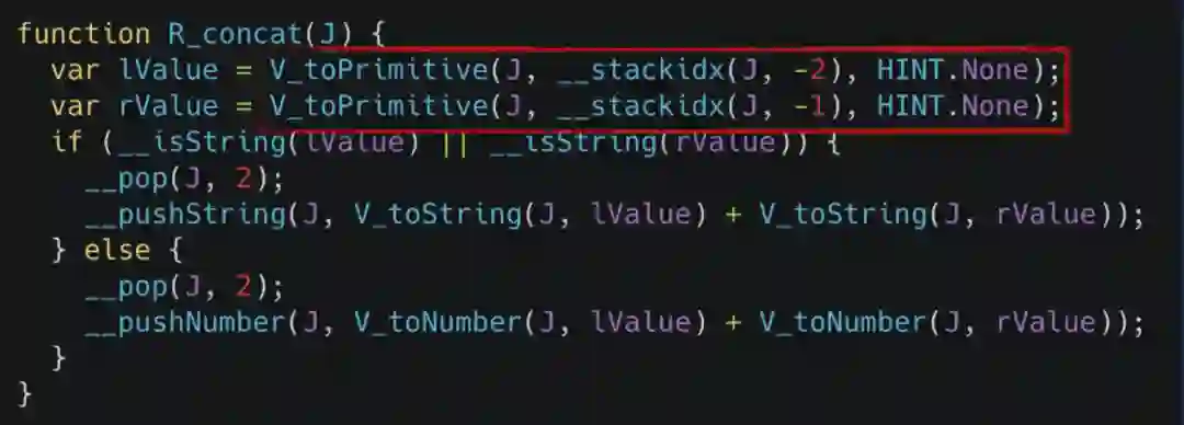 在这个实现里 toPrimitive 函数是其中最为重要也是非常重的一个函数。其内部逻辑简单来说就是它会去判断传入参数的类型,然后决定要不要调用原型上的 toString 以及 valueOf 方法,剩余的逻辑大家可以看到都是比较简单的,因此我们的优化重点就在于如何尽可能少的去调用 toPrimitive 函数。