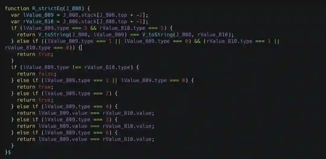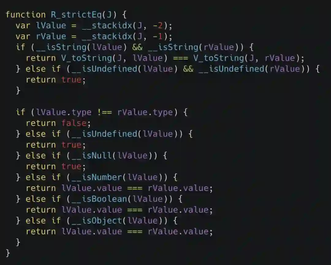 对于其他语言而言,要进行 Inline Function 这样的操作,最简单的办法就是使用宏,但我们知道 JavaScript 其实是没有这个语言特性的,所以说需要一些其他手段来达成。在这里我们先举一个 sablejs 代码中的例子。比如我们把 ECMA5.1 规范里的 strict equal 操作等价的写为代码,其类似于下面的样子。