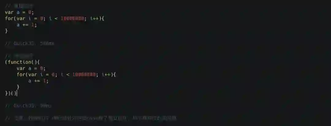 接着我们要简单讲讲关于作用域的优化,需要注意的一点是关于这块的优化每种实现都不一致,所以可能你在 V8 上不会发现任何区别,但在其他引擎上就会出现比较大的性能差距,这里我们主要拿 quickjs 来作为例子,让我们来看下方的代码示例。
