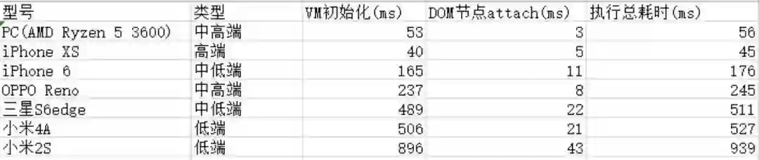 那么除了执行性能外,我们同样也需要考虑到 VM 初始化的性能。从表中可以看到,sablejs 在低端机的初始化时间都在 1 秒以下,而对于主流的硬件来说,VM 初始化时间的影响是非常理想的。