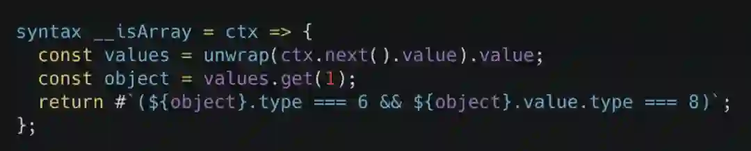 由于 JavaScript 没有宏这个东西,所以我们去社区找了一个较为成熟的宏的语法扩展:sweet.js。它的使用很简单,例如下图,我们使用 syntax 语法定义了一个 __isArray 函数,在编译过程中,如果你的代码有使用这个宏,那么编译器会把对应的 AST 对象传递给你的宏函数,最终你根据对应的相关信息生成一个语法节点返回给编译器即可执行展开操作。