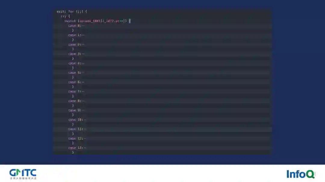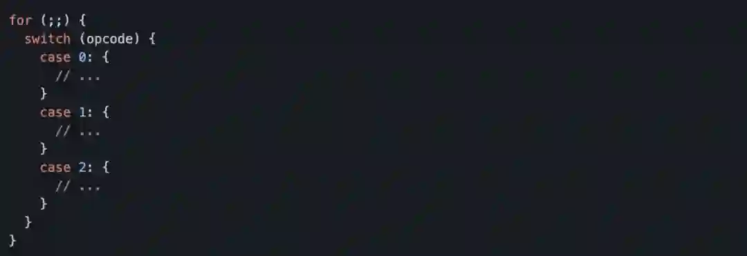 像这个一千万次的加法测试,大家可以发现 2.0 版本相比于 1.0.6 版本快 2 倍多,同时相比于 quickjs 的 WebAssembly 版本只慢了 17.39%,整个性能的提升是非常让人兴奋的。那怎么达到的呢?实际上也很简单,回到我们最开始的时候关于栈机的部分,从下图我们可以看到,栈机的实现都会有一个经典的 switch-case 结构,并且通过上面的介绍我们也知道,这个大循环里的 switch-case 是非常影响分支判断的,那么如果要在我们上述优化方案的基础上再进行优化,那唯一的思路就是:取消掉整个大循环里及其 switch-case。