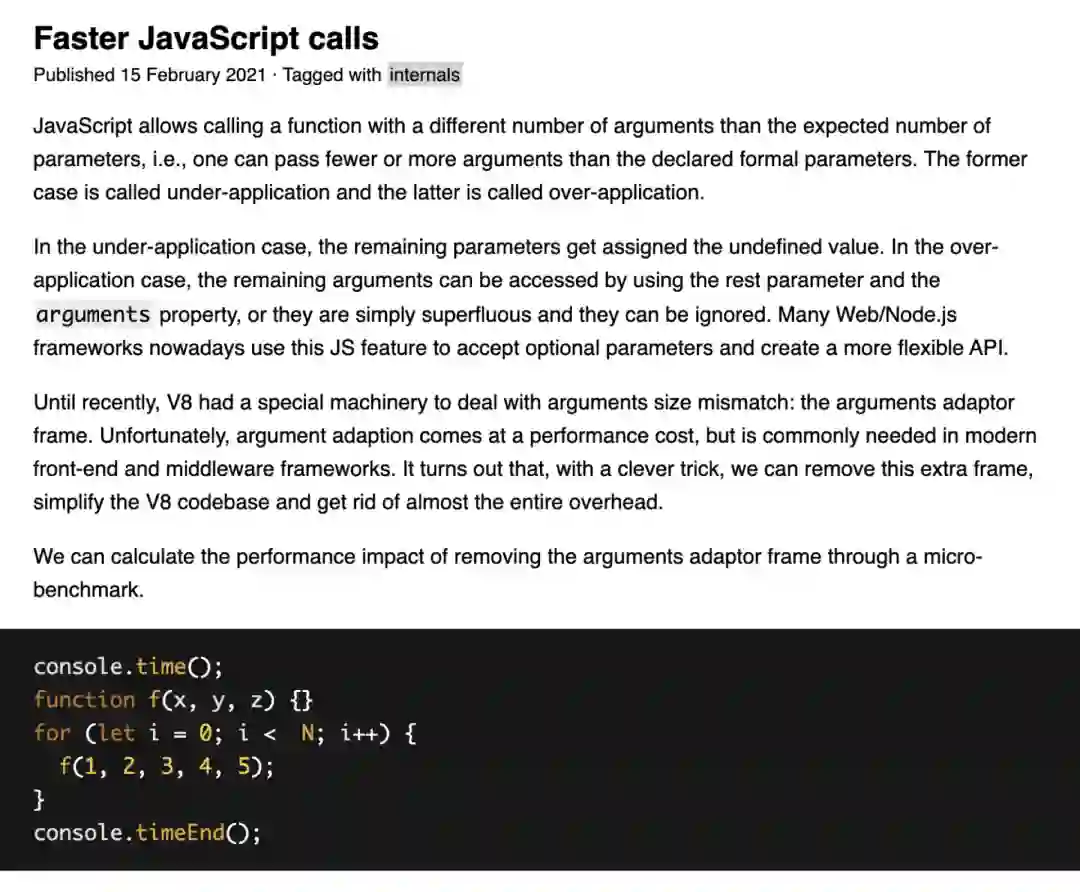 我们简单来说,假设我定义了一个含有三个参数的函数,而当我在调用这个函数的过程中我传入了五个参数,那么在这个情况下会造成什么问题呢?我们知道 JavaScript 非常灵活,如果传入参数不匹配的话,我们可以通过 arguments 来获取到其他参数。但是这种情况实际上是有代价的,因为多余的参数在底层是需要一些包装才能放置在 arguments 中的,因此如果对应函数调用太过频繁,那么这个包装的成本也是非常大的,因此如果要解决这个问题的话,我们仅需要保证参数的匹配即可。