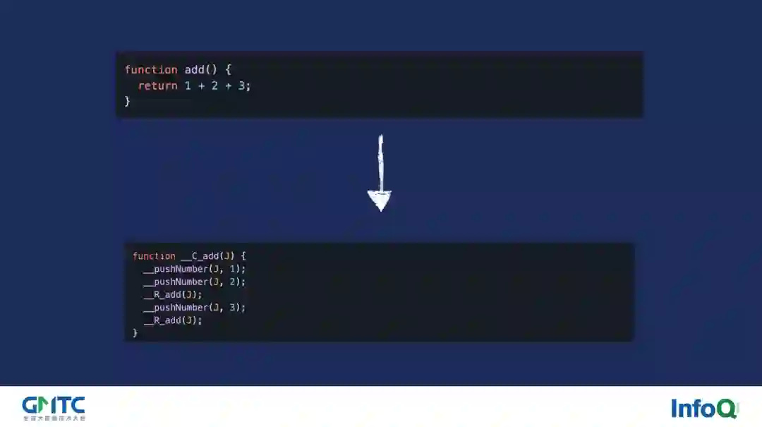 如何去做呢?实际上就是把对应的语句直接翻译为栈操作,然后让 V8 帮助我们去 JIT 每一个函数,它的整个过程如下图所示。