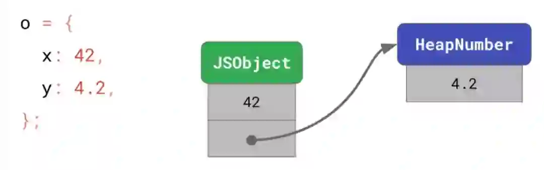 在这里我们可以看到,如果你申明了一个对象,这个对象的某个值为 42,从上面我们可以知道,42 肯定是一个 SMI,因此这个值是直接存放在了内存之中。但如果是个浮点数,比如 4.2,那么这个数实际上会在堆内存上另外开辟一块内存,然后进行这个数值的存放,而在这个对象内部由一个指针进行这块堆内存的访问。
