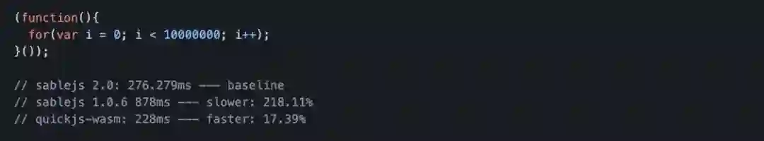 最后的最后我们要说一说 sablejs 后续的规划:sablejs 2.0。2.0 的目标主要分为两块,一块是性能的继续的提升,一块是内部模块动态加载。由于现在 2.0 的完成度还非常低,因此完整的 V8 Benchmark Suits 是没有办法跑起来的,为了展示一下 sablejs 2.0 的性能提升效果,我们用一个下面的简单例子来说明。