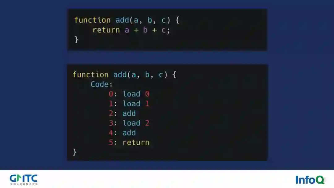 为了方便解释我们用一个简单的 add 函数来进行介绍。如图的 add 函数,如果我们将其转化为 opcode 表示的话,实际上他类似于图中下方所示。load 0 代表将 a 变量压栈,load 1 代表将 b 变量压栈,接着我们调用 add 指令将两者取出相加并将对应结果压栈从而完成 a+b 的操作。然后 load 2 又将 c 变量压栈,然后再次调用 add 指令取出相加并将对应结果压榨,最后 return 指令返回栈顶结果,结束完整个 add 函数的调用。