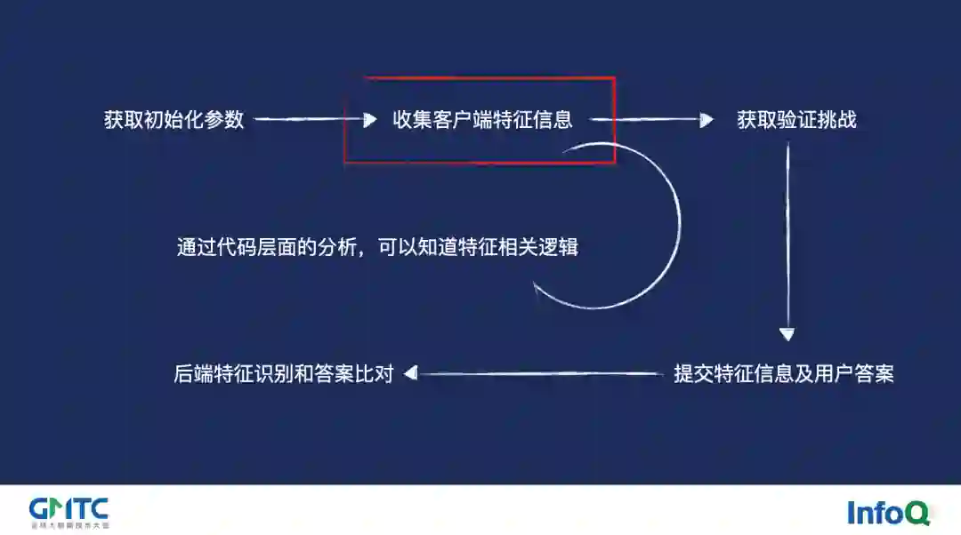 从上图我们可以看到验证的整个流程包含了:获取初始化参数、收集客户端特征信息、获取验证挑战、提交特征信息及用户答案、后端特征识别和答案比对这五个关键步骤。其中最核心的,同时也是最脆弱的部分就是客户端的特征收集。之所以要收集客户端的特征信息,是因为我们要以此来产出一个唯一的设备指纹来定位到唯一用户,以便帮助我们的模型来确认当前用户是否存在行为的异常,及时对恶意请求进行阻断,减少企业的被攻击风险。