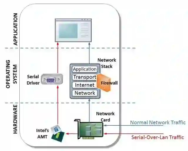由于英特尔AMT SOL是英特尔ME(管理引擎)的一部分,英特尔ME(管理引擎)是嵌入了英特尔CPU的独立处理器,它运行着自己的操作系统。即使在主处理器断电的情况下,英特尔ME也能运行,虽然这个功能看起来相当黑暗,但是英特尔还是建立了ME来为管理大型数千台计算机网络的公司提供远程管理功能。在ME组件堆栈中,AMT为Intel vPro处理器和芯片组提供远程管理功能。AMT SOL是Intel AMT远程管理功能的Serial-over-Lan接口,可通过TCP公开虚拟串行接口。由于AMT SOL接口在Intel ME内部运行,因此它与防火墙和操作系统的防护软件是相互独立的的。