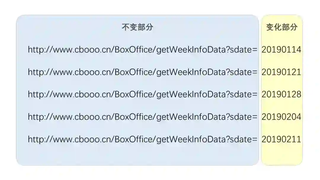 url_df = pd.DataFrame({'urls':['http://www.cbooo.cn/BoxOffice/getWeekInfoData?sdate=' for i in range(5)],'date' :pd.date_range(20190114,freq = 'W-MON',periods = 5)})