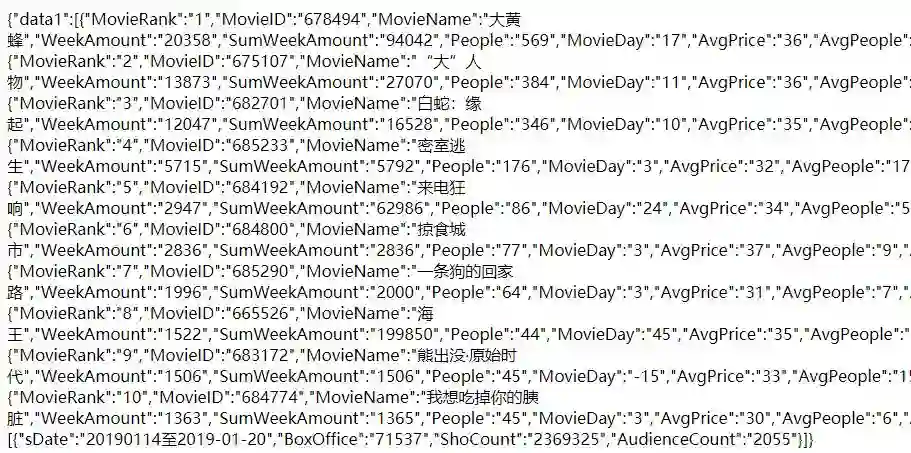 该网站的周票房json数据地址可以通过抓包工具找到,网址为http://www.cbooo.cn/BoxOffice/getWeekInfoData?sdate=20190114