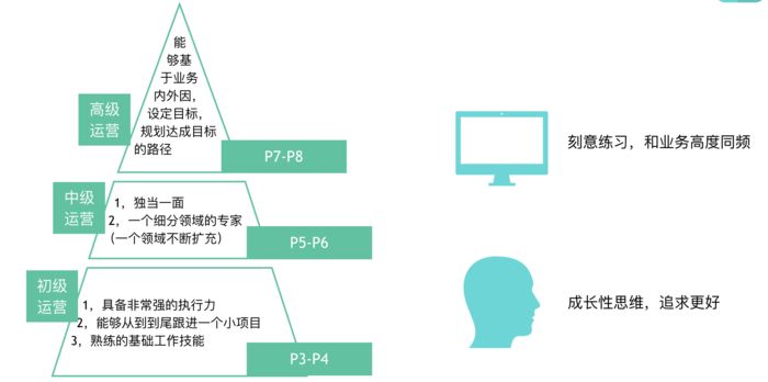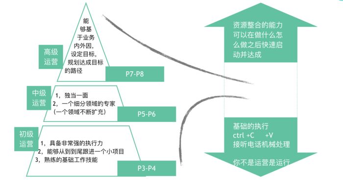 当然在 P3~P8 以外的两端,现在的阿里百度基本上不再招聘 P1 和 P2 ——因为这个区间内做的事情基本上是复制粘贴,执行流程这样简单机械的工作,基本上已经外包出去了,而且这样的工作只能成为是运行而不是运营(人人都是产品经理专栏作家韩利老师的文章《姑娘,你不是运营而是运行经理》有提到)。
