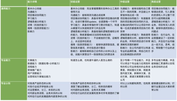 每一个阶段的运营都需要具备的能力,只是某些通用能力会随着专业能力的提升,业务专精度的提升,在不同的阶段有更高的要求。