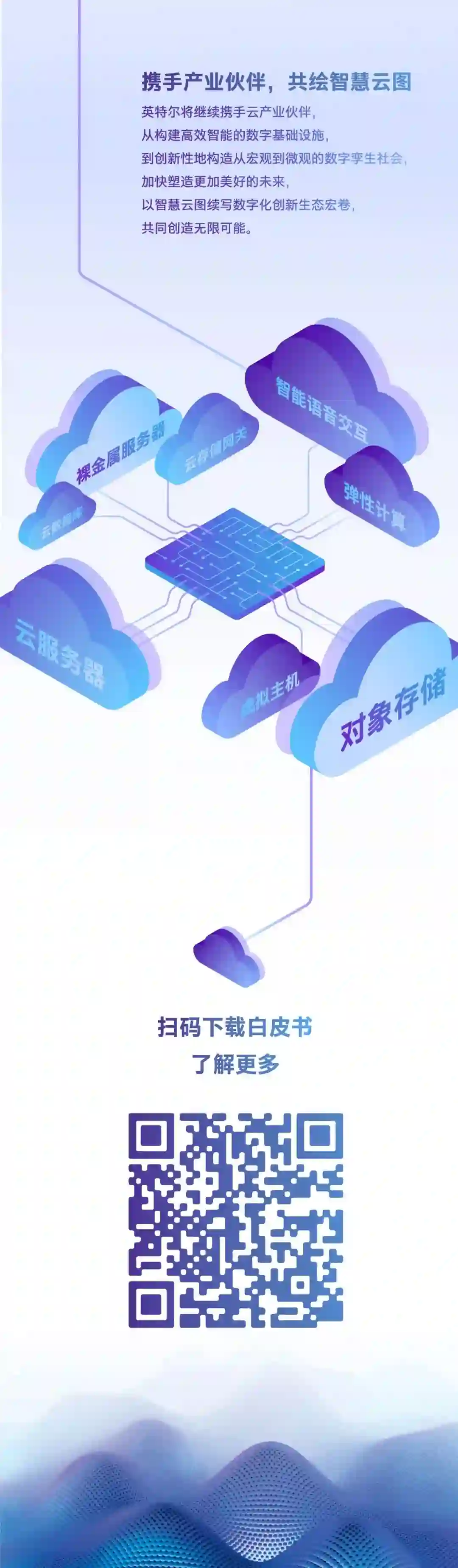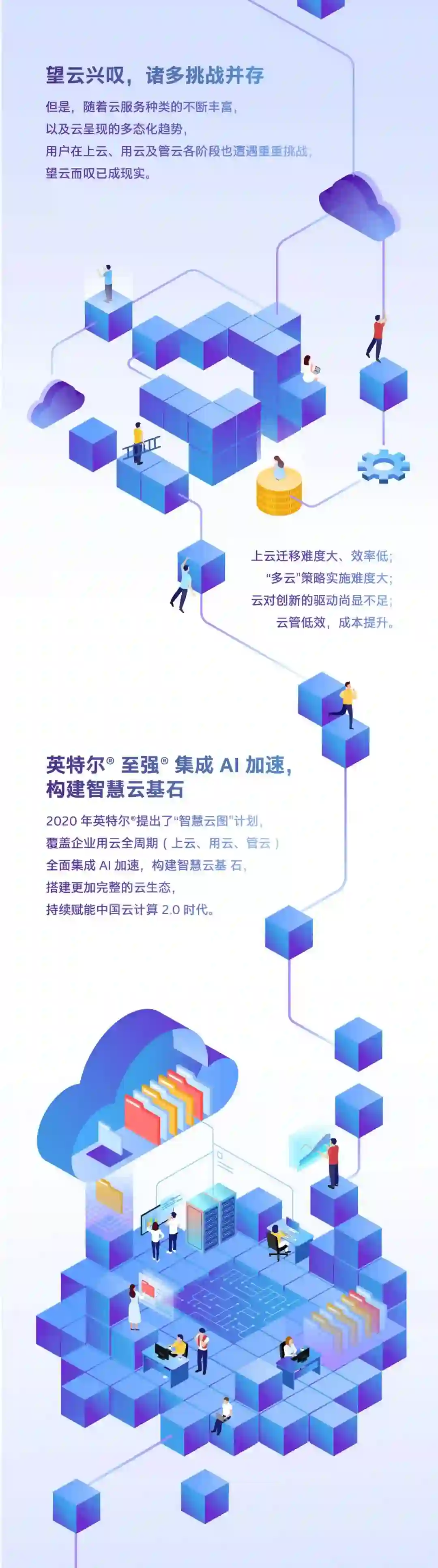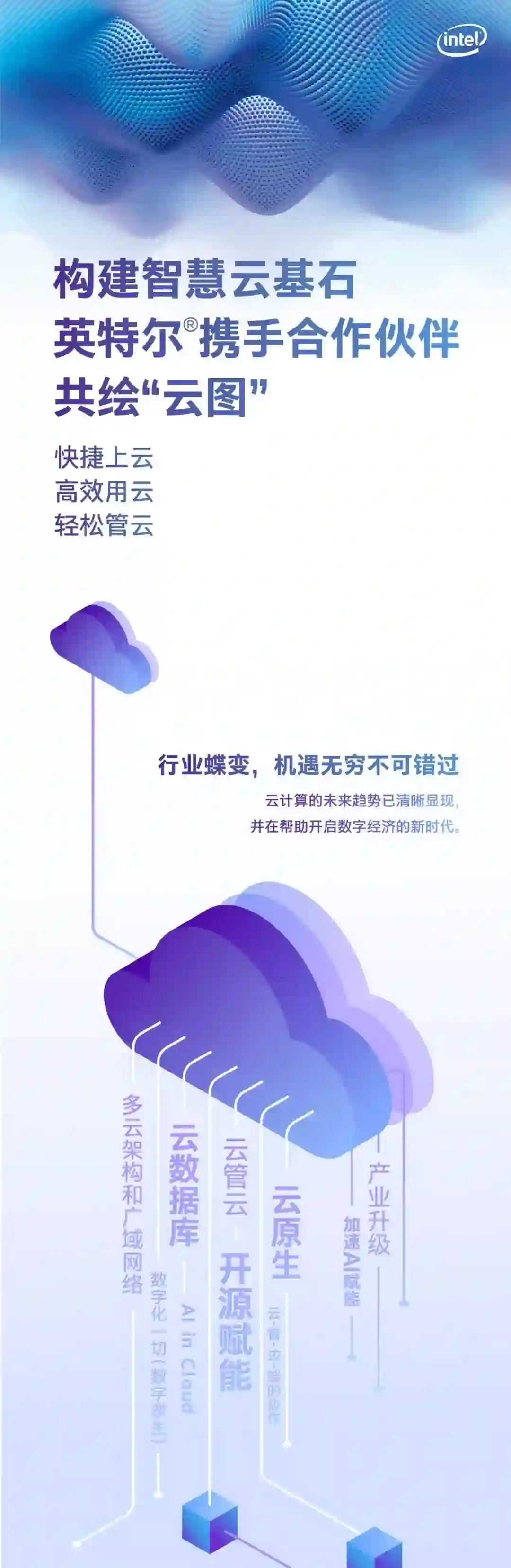顺应行业发展趋势,英特尔致力于构建智慧云的基石。它于今年提出了“智慧云图”计划,旨在覆盖企业用云的整个周期,即上云、用云和管云全流程,通过第二代英特尔® 至强® 可扩展处理器、英特尔® 傲腾™ 持久内存、英特尔® 傲腾™ 固态盘和英特尔® FPGA等产品组合,全面集成AI加速,构建智慧云基石,搭建更加完整的云生态,持续赋能中国云计算2.0时代。
