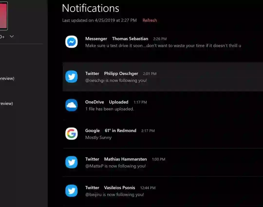 根据 Nath 提供的一张截图,Your Phone 应用将会拥有全新的「通知」标签页,它似乎支持同步用户手机端收到的所有通知,其中包括 Facebook Messenger、Twitter 等通知以及 OneDrive 的更新。此外微软的 Analy Otero Diaz 还表示,一旦用户在 PC 端对通知进行处理,那么在手机端也会消失,反之亦然。(来源:cnBeta)