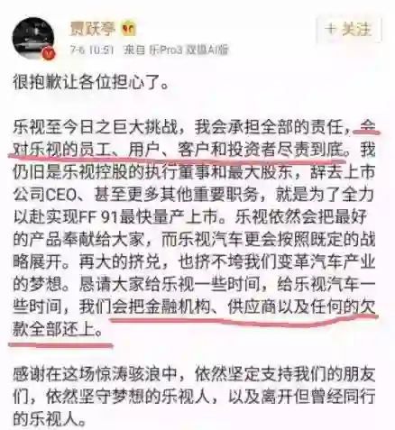 贾跃亭午间发公开信:我会尽责到底,把欠款全部还上。